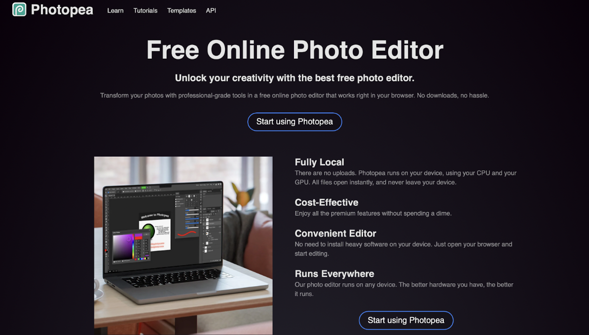 Photopea est une alternative en ligne gratuite à Photoshop, qui permet de travailler directement dans votre navigateur. Il prend en charge des outils comme les calques, les masques et les filtres. Il est parfait pour des retouches rapides et puissantes sans avoir à installer un logiciel.